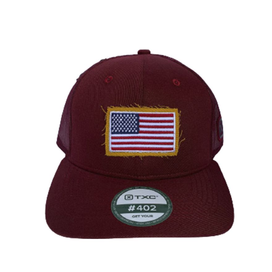 Fabricado em tecido 50% Algodão/ 50% Poliéster, na cor Bordo, Bordado na copa em alta definição com a bandeira do EUA, Forma pequena, Aba curva, copa redonda, six panels com respirador, tela trazeira na cor bordo lateral com bordado TXC.